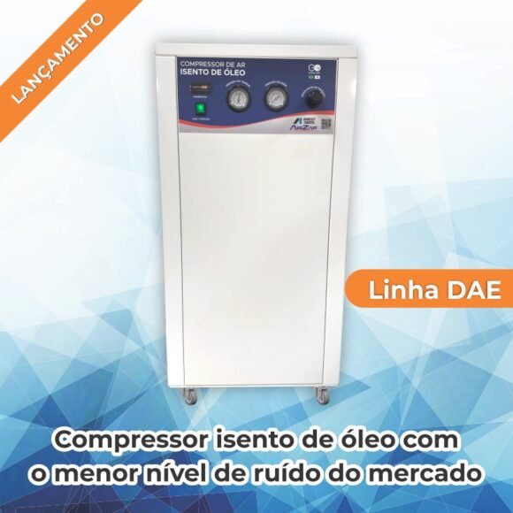 Compressor de ar isento de óleo, super silencioso, para atender demandas que exigem ar limpo, como áreas da odontologia, médica, alimentícia e laboratorial.